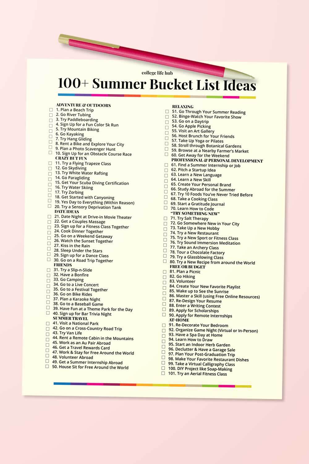 Summer Bucket List Ideas for College Students Printable PDF Printable for Personal Use